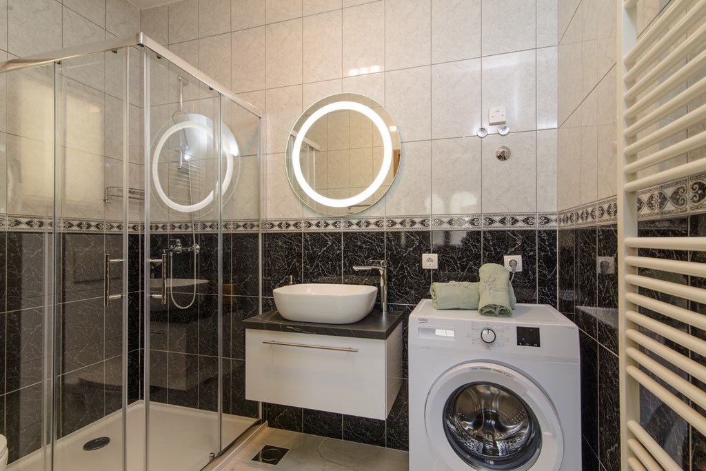 - bathroom (shower, basin, toilet, washing machine, hairdryer) + toilet (toilet, basin)